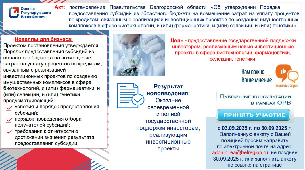 Оценка регулирующего воздействия проекта постановления Правительства Белгородской области «Об утверждении Порядка предоставления субсидий из областного бюджета на возмещение затрат на уплату процентов по кредитам, связанным с реализацией инвестиционных проектов по созданию имущественных комплексов в сфере биотехнологий, и (или) фармацевтики, и (или) селекции, и (или) генетики»