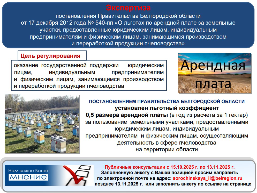 Экспертиза постановления Правительства Белгородской области от 17 декабря 2012 года № 540-пп «О льготах по арендной плате за земельные участки, предоставленные юридическим лицам, индивидуальным предпринимателям и физическим лицам, занимающимся производством и переработкой продукции пчеловодства».
