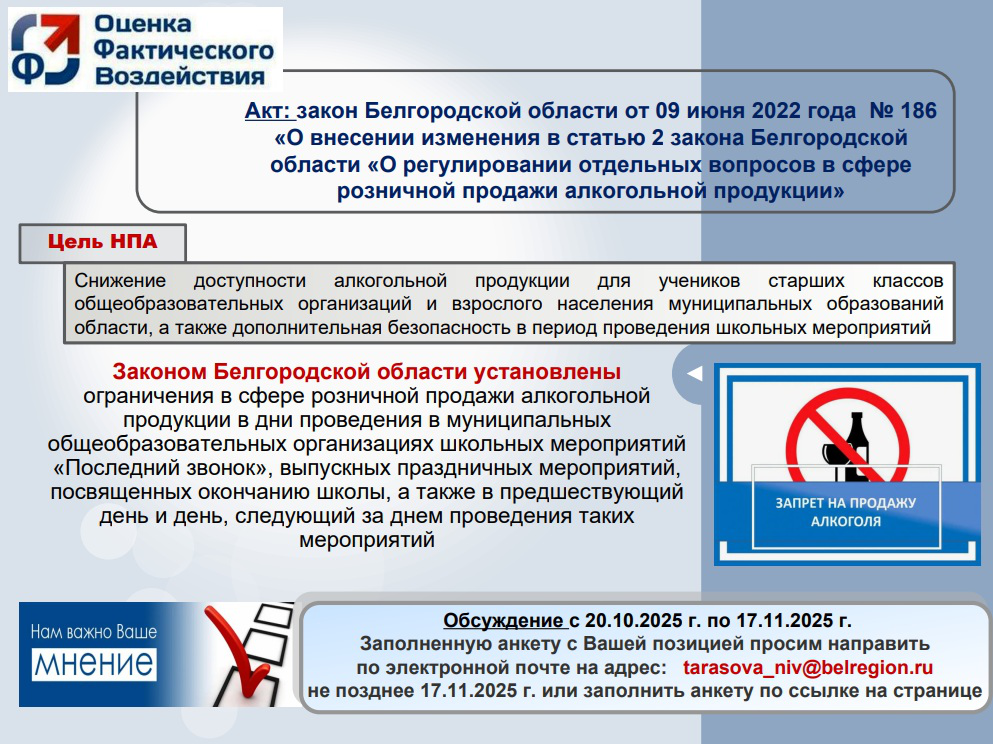 Оценка фактического воздействия закона Белгородской области от 09 июня 2022 года № 186 «О внесении изменения в статью 2 закона Белгородской области «О регулировании отдельных вопросов в сфере розничной продажи алкогольной продукции»