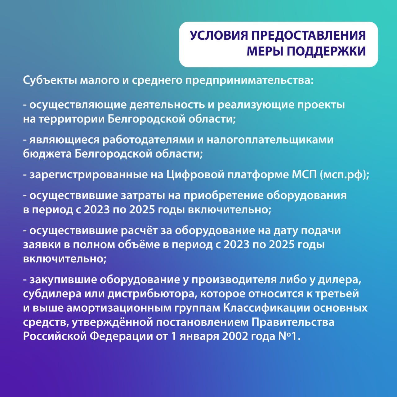 - осуществившие затраты, связанные с приобретением оборудования в целях создания и расширения производства товаров (работ, услуг) на территории Белгородской области, произведены в период с 2023 по 2025 годы включительно;